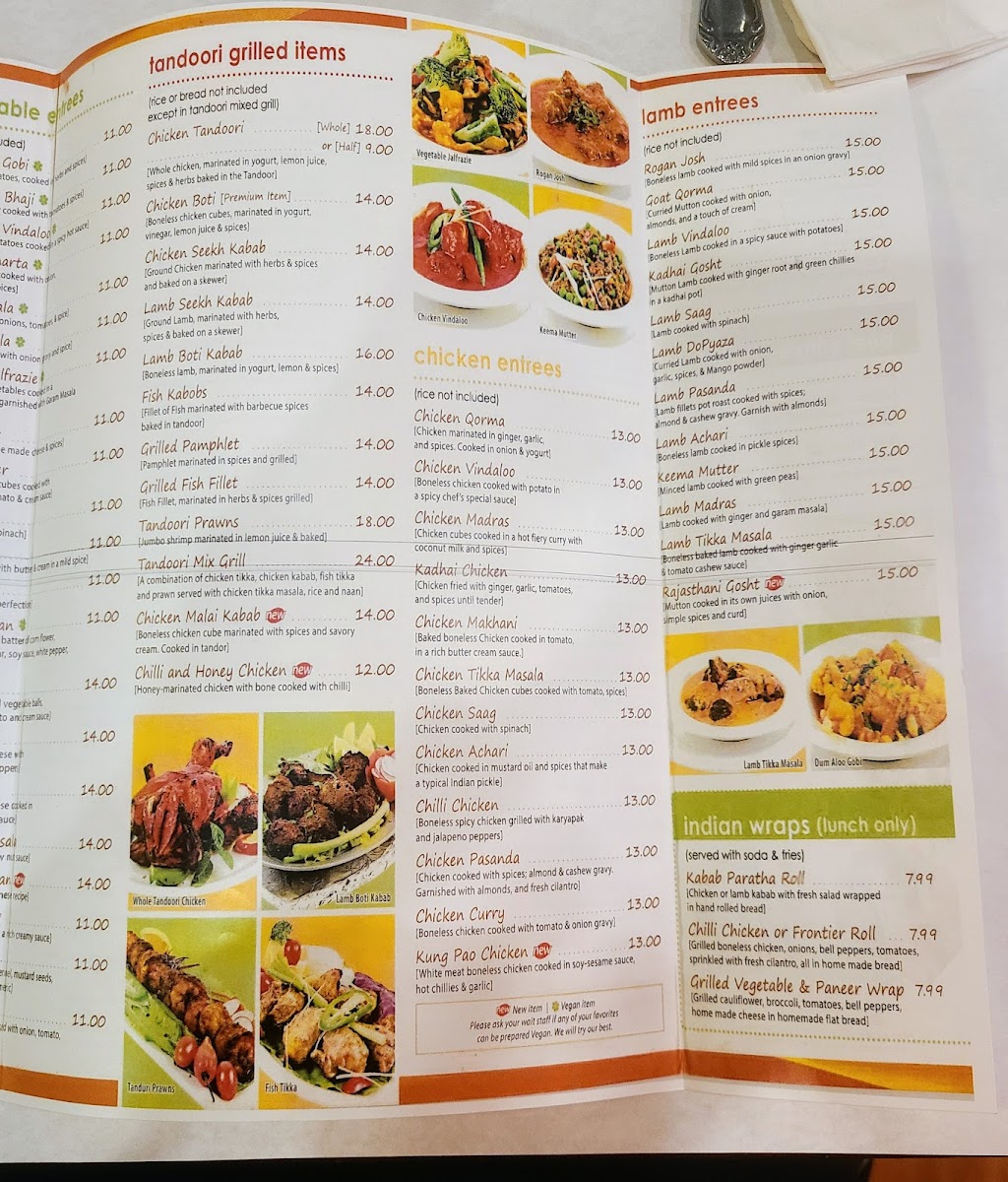 For something quick and flavorful, the Indian Wraps menu features delightful options like the Frontier Roll, Kabab Paratha Roll, and the spicy Chili Chicken Roll, perfect for a casual meal.