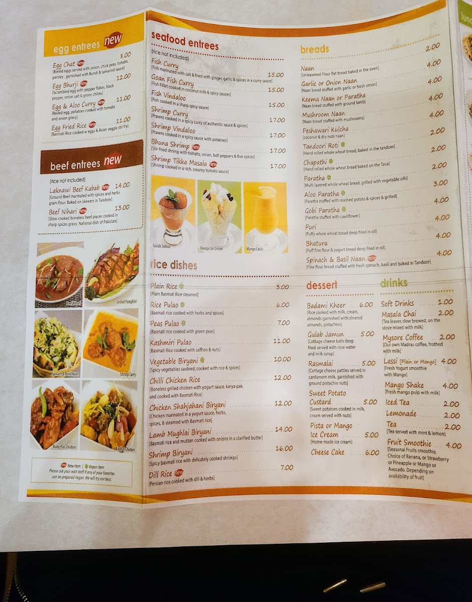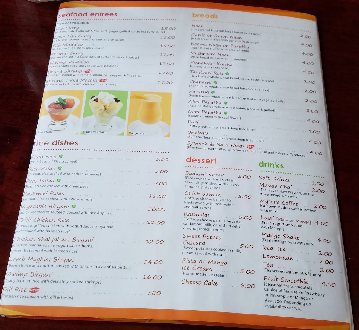 The breads menu is a treat for naan and paratha lovers, featuring choices like the rich Gobi Paratha, the savory Keema Paratha, and the classic Onion Naan. There are also unique options like the Peshawari Kulcha and crispy Tandoori Roti.